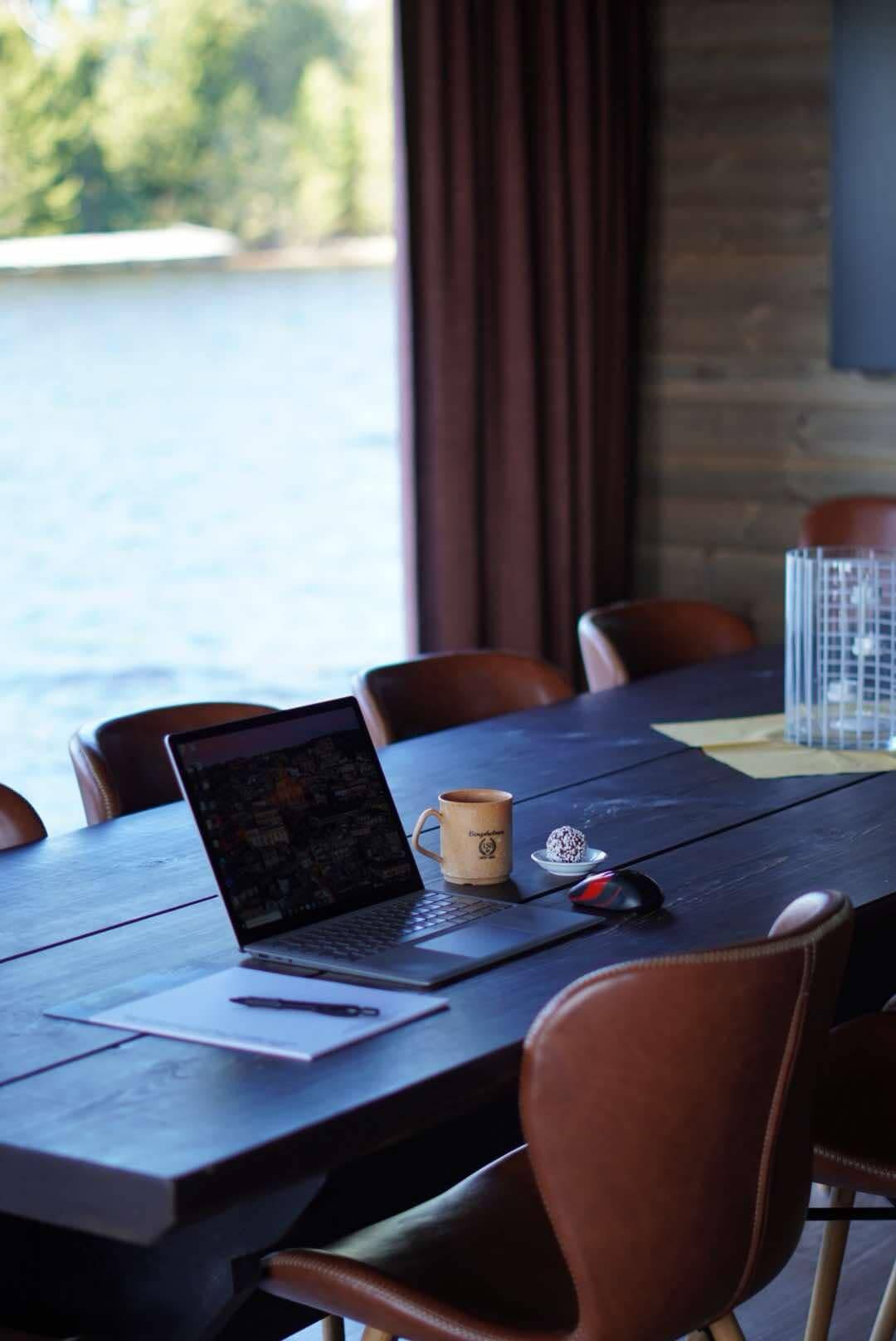 Konferensutrymmet har 16 st platser med high-tech storbilds TV-skärm, Wi-fi och full teknisk utrustning samt kök med kyl, bastuhanddukar, wc/dusch och separata omklädningsrum. Ni får tillgång till vedeldad bastu och vedeldat vildmarks-spa ombord på flotten.